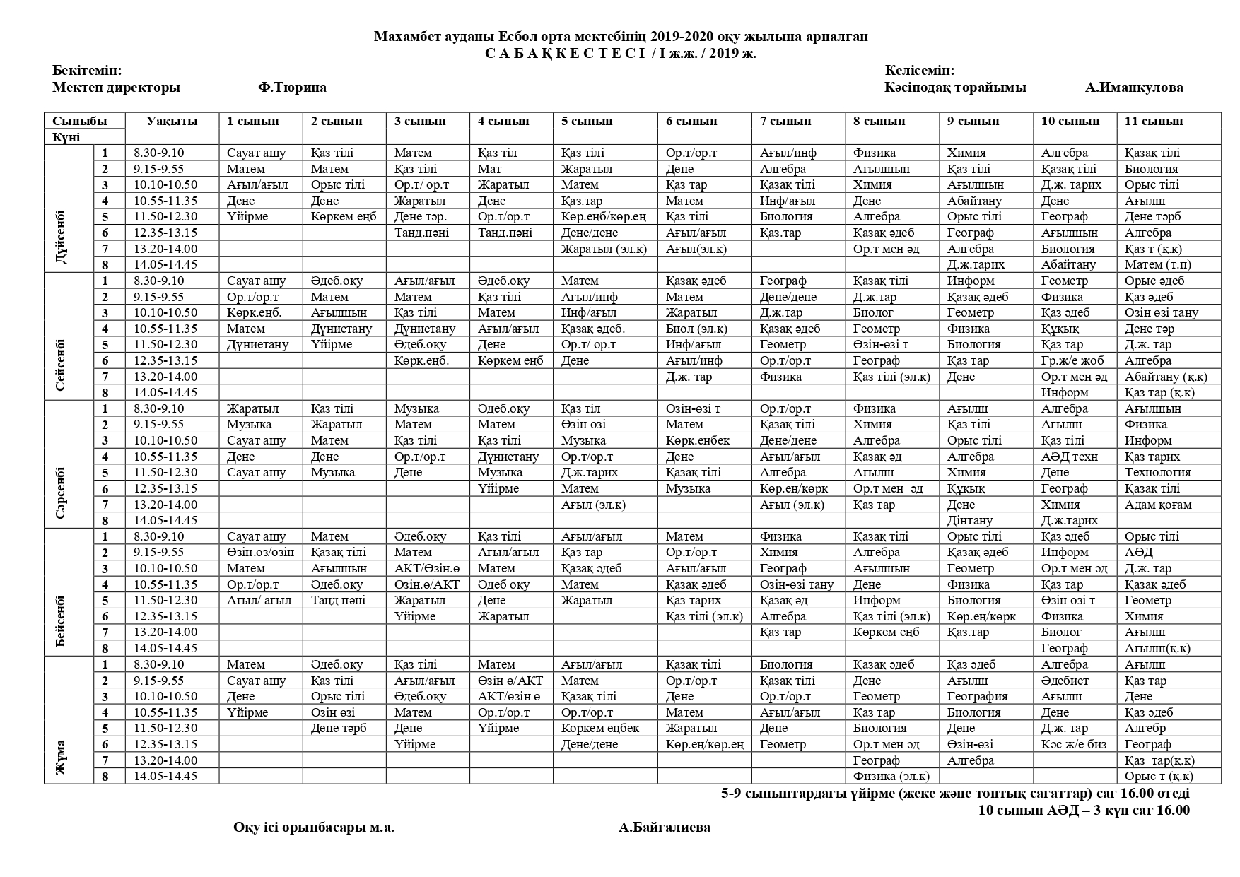 2019-2020 оқу жылына арналған сабақ кестесі