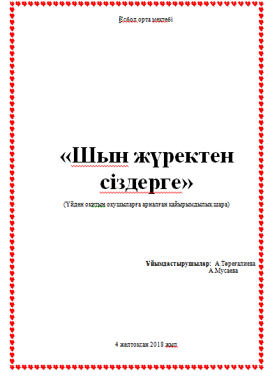 Қайырлы күн! Қадірлі қауым, ел тірегі, ертеңіміздің кепілі болған жас достар! Армысыздар жаны жайсаң, жүрегі жомарт ұстаздар мен ата-аналар! Сіздерді бүгінгі біздің белсенді оқушылардың ұйымдастыруымен өткелі отырған «Шын жүректен сіздерге» атты концерттік бағдарламамызға қош келіпсіздер! Бүгінгі біздің кешімізге оқушылар, ата-аналар, ұстаздар қатысып отыр.
