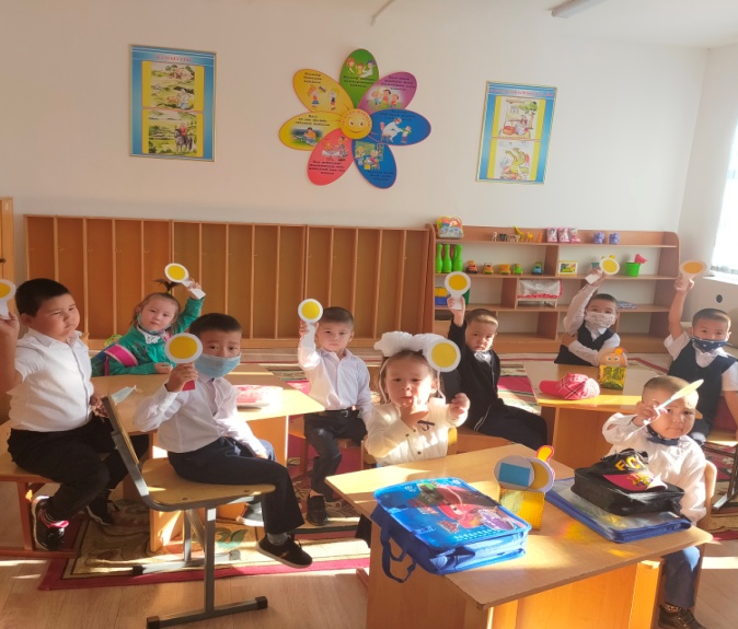 Оқу қызметін қорытындылай келе алдарындағы қалақшаға жапсырылған пішіндерді туға ұқсайтын,елтаңбаға ұқсайтын (түстері,пішіндері) қалақшаларды көтереді.