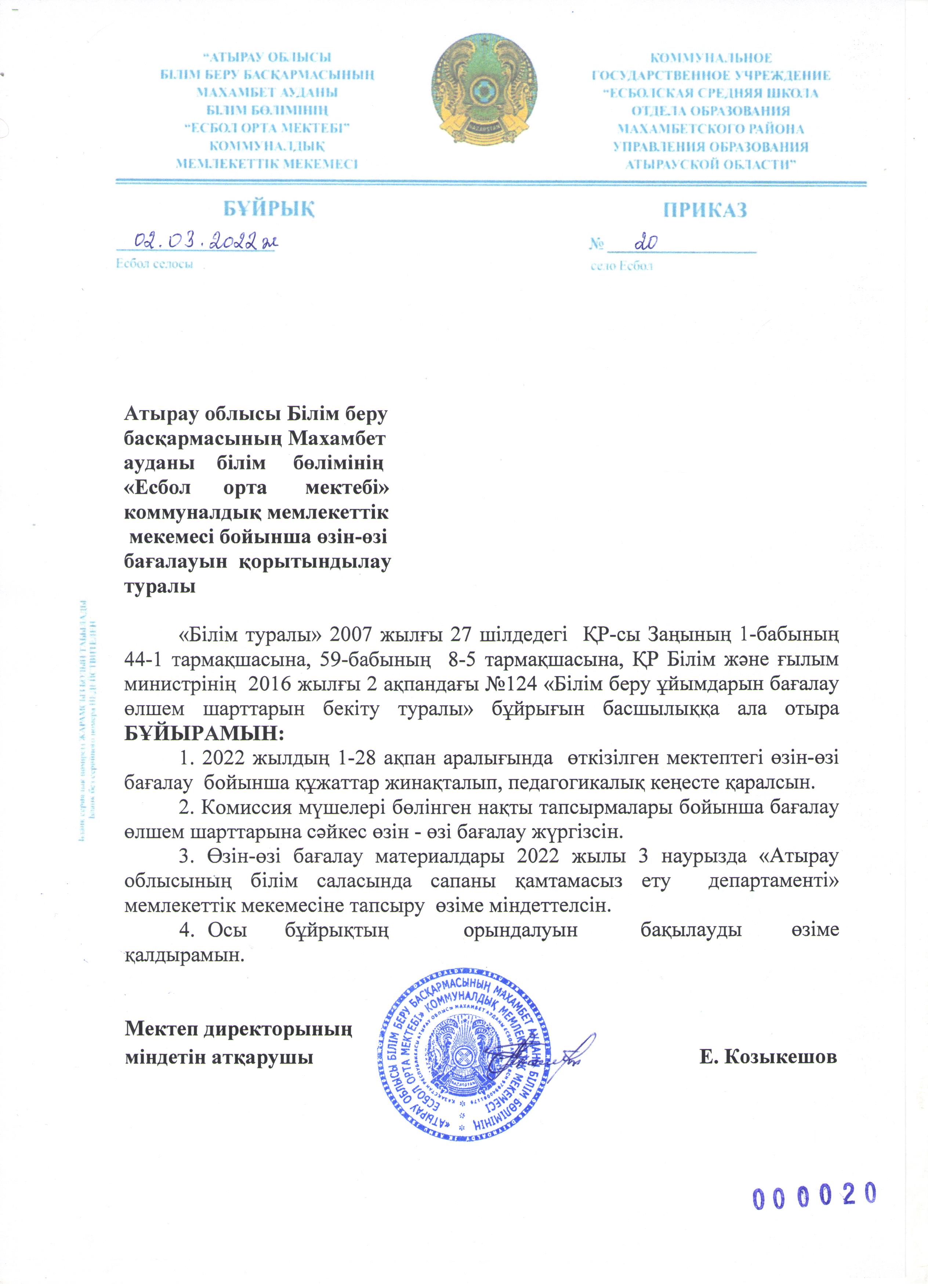 | 2 | өзін -өзі бағалауды ұйымдастыру бұйрығы |